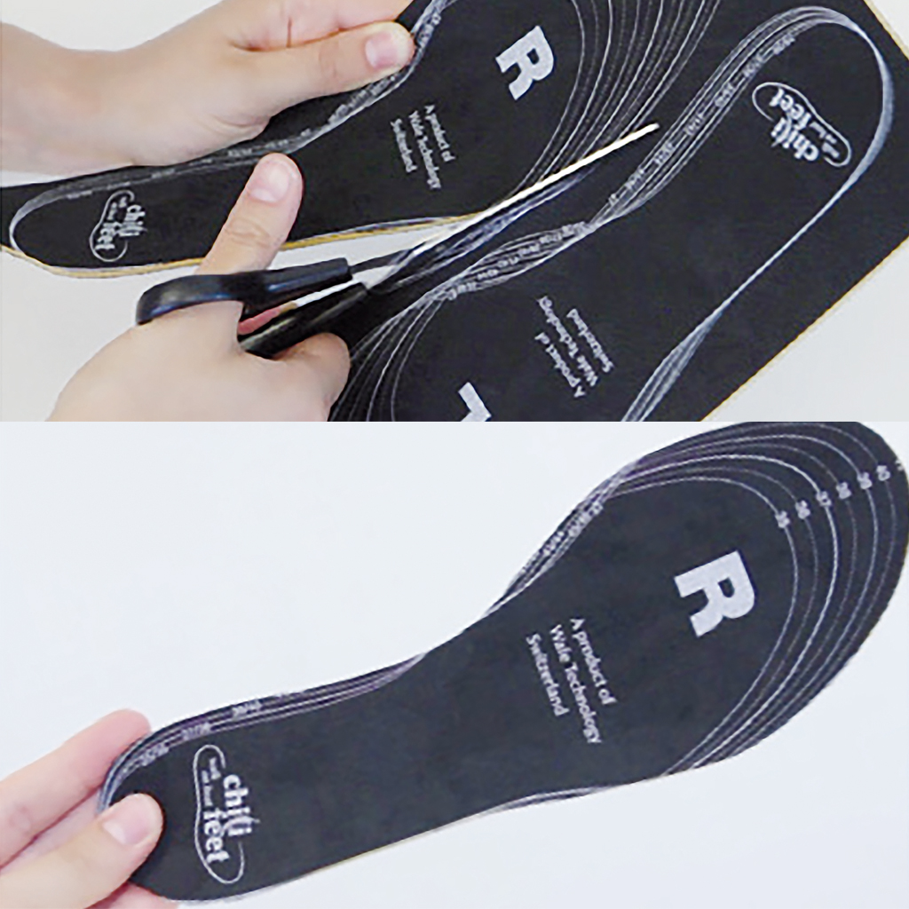 - Stellen Sie sicher, dass Sie ausreichend Platz in den Schuhen haben. Falls der Fuss zu eng im Schuh sitzt, ist das Zusammendrücken erschwert und damit vermindert sich die Wärmeproduktion.